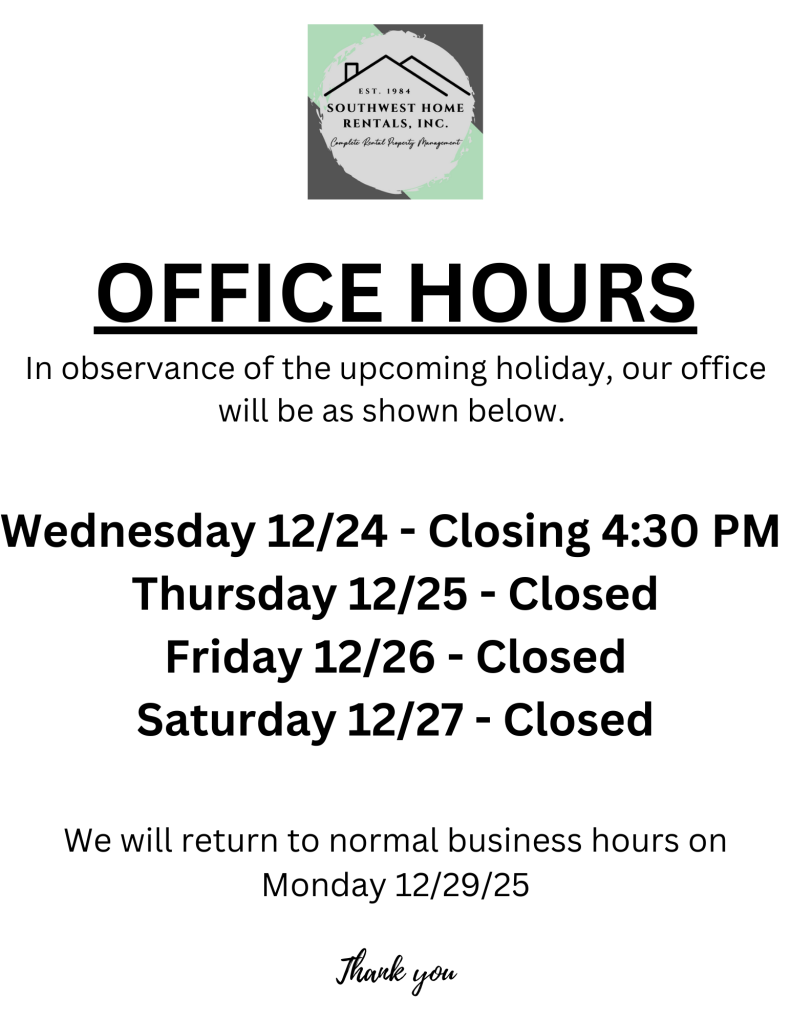OFFICE HOURS CHRISTMAS WEEK In case of a maintenance emergency only, call Maintenance Supervisor Mike (405) 905-1539 Like, share & follow! Share on Facebook (Opens in new window) Facebook Email a link to a friend (Opens in new window) Email Print (Opens in new window) Print Like Loading...